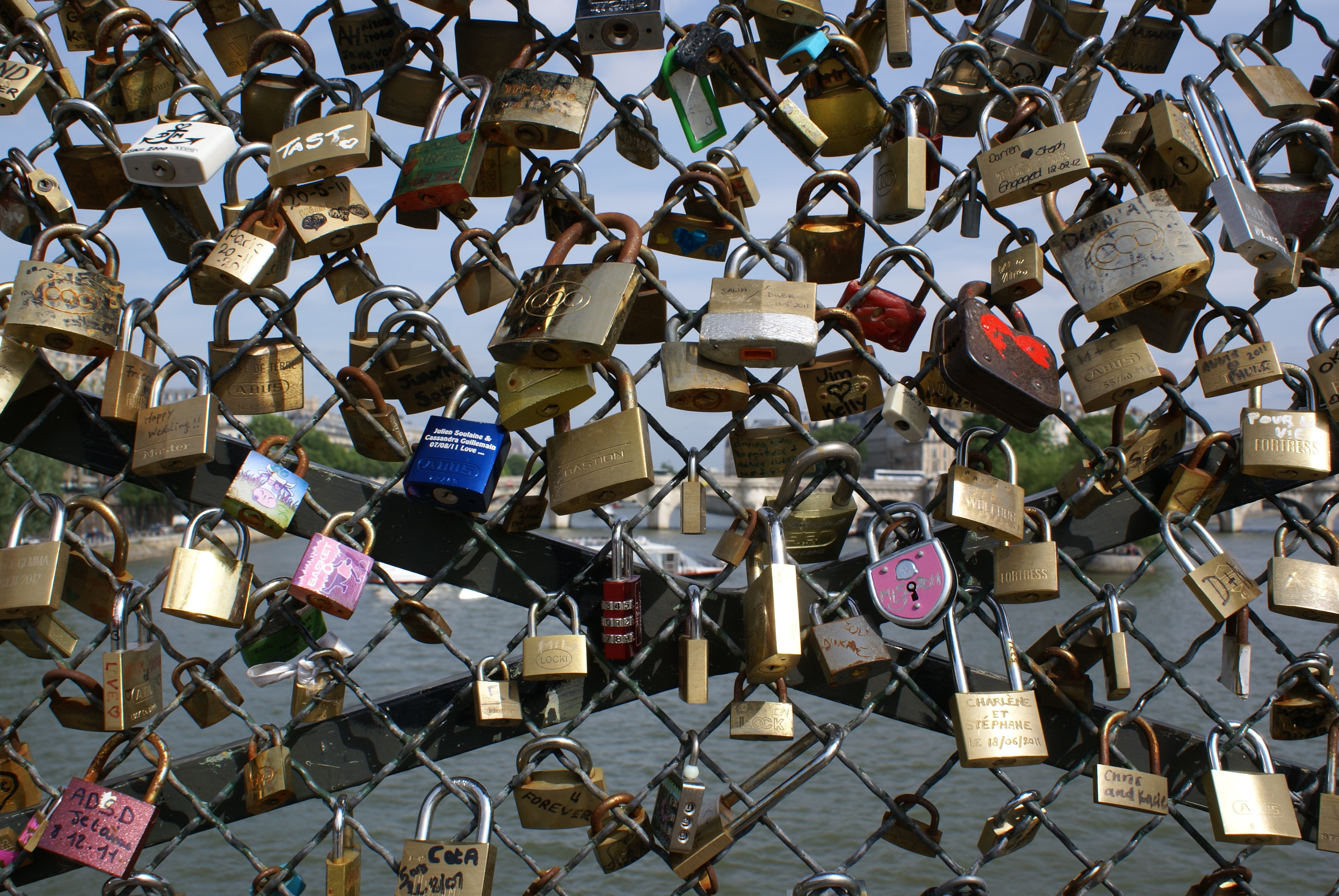 Much as I enjoy Paris, I am also an eye-rolling cynic with regards to anything even remotely suggestive of romantic love. There is some strange new tradition in Europe that has couples writing their names on padlocks, then attaching them to chain link fences (preferably over a bridge) and throwing the key away. I cannot buy this as a gesture of love because, well, it’s absurd. What is it meant to signify?