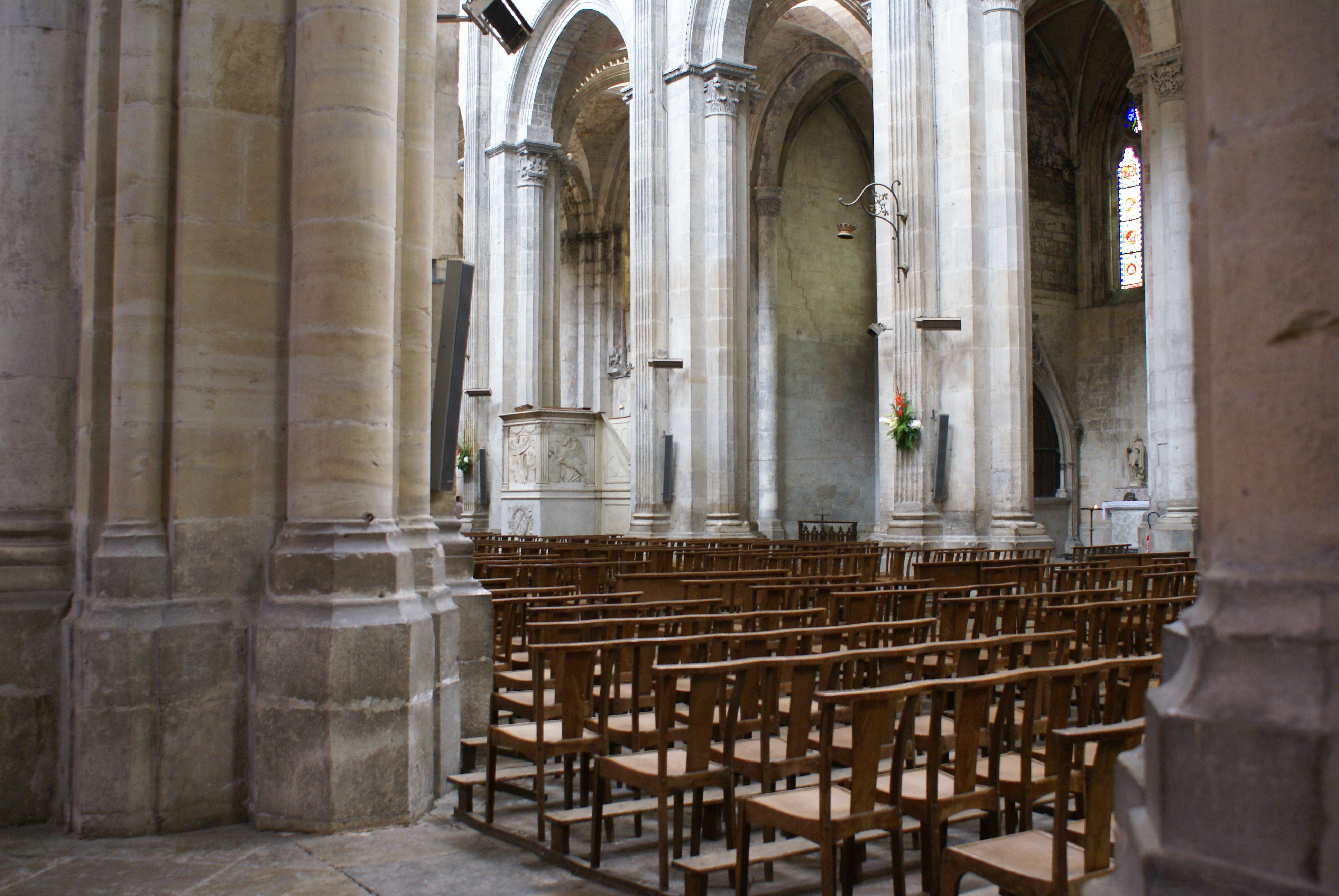 About halfway into the ride, it began to drizzle slightly, and naturally by the time we arrived in Vienne, the drizzle had turned into full-on rain. Vienne’s businesses tend to be closed on Sunday and Monday, which interfered in our brilliant plans to purchase an umbrella in town. The only shop we found that was open was a small grocery store. They had no umbrellas, so we asked a clerk where we might find one. She did not have any ideas, and only offered that most of the shops were closed. The elderly gentleman she was serving jumped in and informed us that there was a larger grocery store that would probably have some umbrellas, and proceeded to give us directions. I was very grateful to him, since I was was not relishing the idea of walking around in soaking wet clothes, not to mention my rising fear about my camera getting wet.