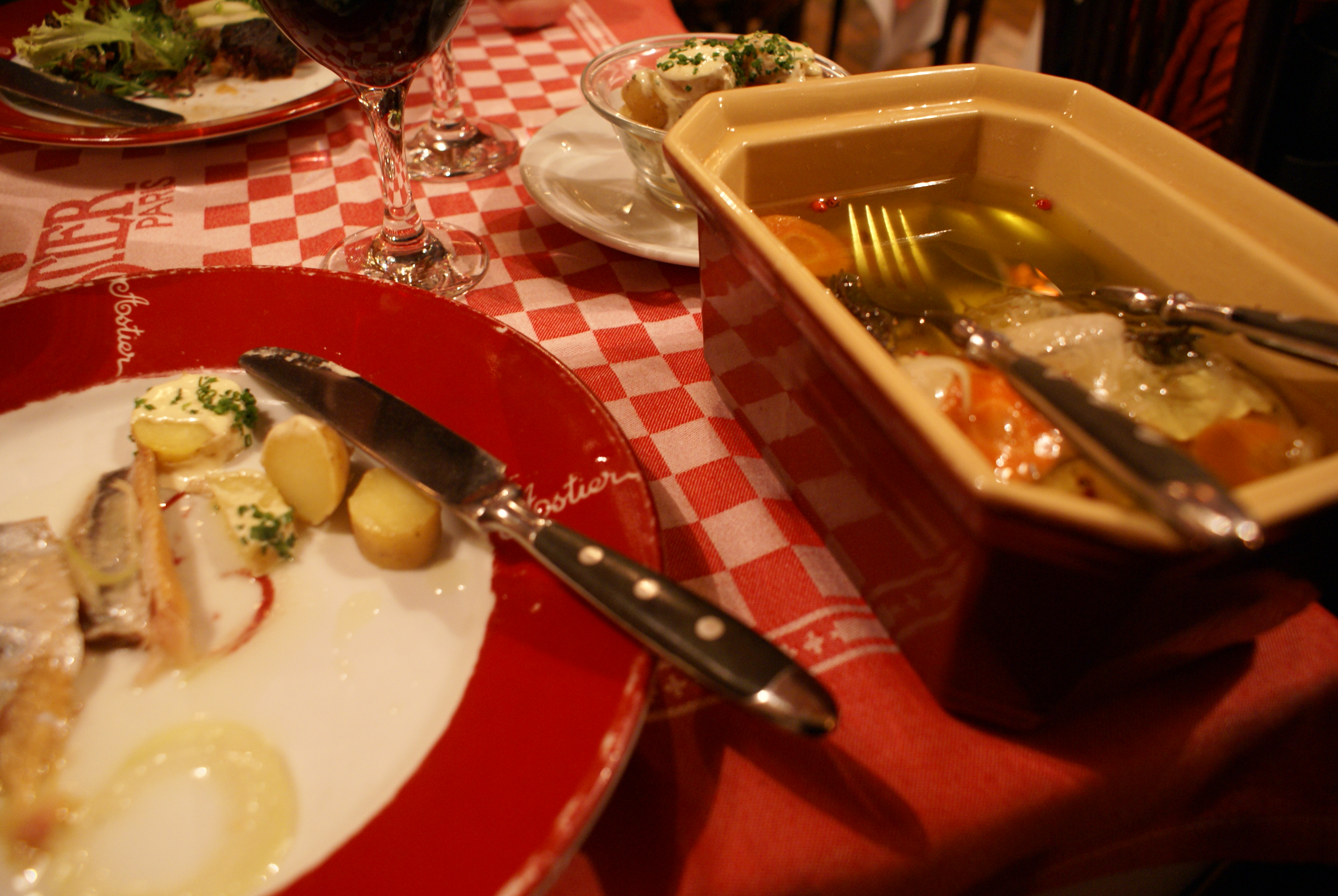 My milestone birthday last night was spent at the tried and true Astier, a classic French bistro. The starter that I ordered was smoked herring with potatoes. Astier is so old-school that they brought my herring in the beautiful crockery in which it was prepared (confit’d in oil with thin slices of onion, carrot, and whole branches of thyme), and placed a serving spoon and fork in it. As they had also placed a small plate and cutlery in front of me, I understood immediately that the herring was served family-style. Still though, as he walked away, the server spun around, hands stretched toward the herring, and urgently advised me that I was not expected to eat the whole thing myself.