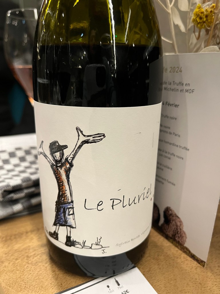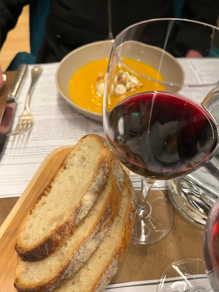Next, I had the “parfait” for my starter, consisting of a poached egg in a mushroom sauce topped with a piece of puff pastry, while David had the “potimarron” soup of squash, smoked haddock, and swirled with mascarpone. We both enjoyed the beer-braised pork cheeks served with lentils and parsnips. Everything was choked down with the help of a bottle of Costières de Nîmes Clos de Boutes “Pluriel”.