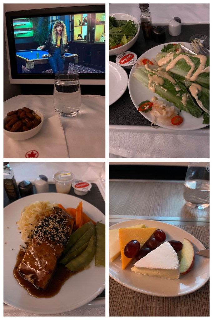 Huge amount of pre-dinner warm almonds on flight 832. Followed by shrimp starter, salmon main, and a cheese course of Oka, cheddar, and camembert.
